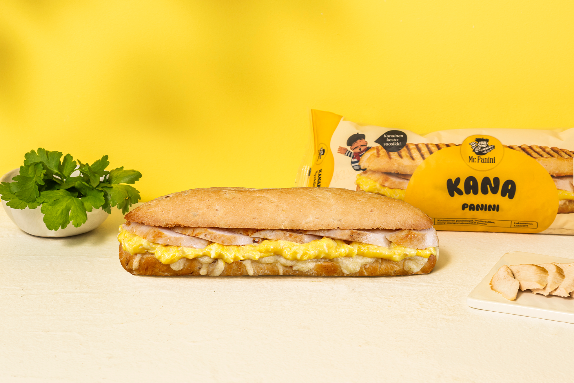 Finländskt paninibröd fyllt med stekt inhemskt kyckling och paninikökets egen curry-mangomajonnäs som innehåller finländsk ost. Kycklingpaninin är laktosfri.