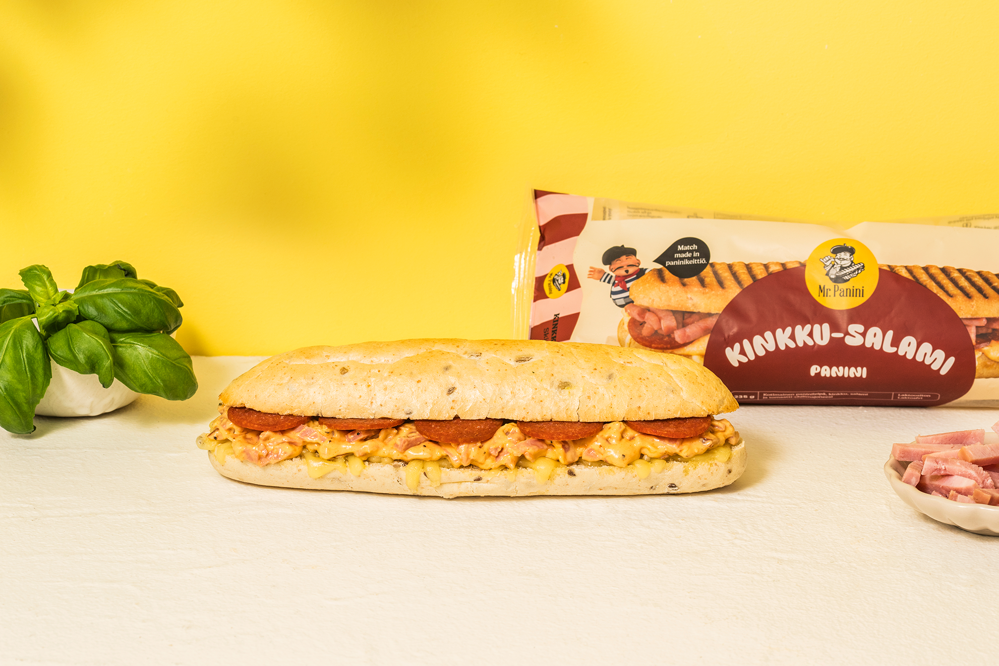 I denna finländska panini är det rejält med kött i fyllningen. Rökt skinka och kryddig salami bildar en mustig smakupplevelse som förstärks med finländsk ost och paninikökets egen tomat- och chilimajonnäs. Skinka-Salami paninin är laktosfri.