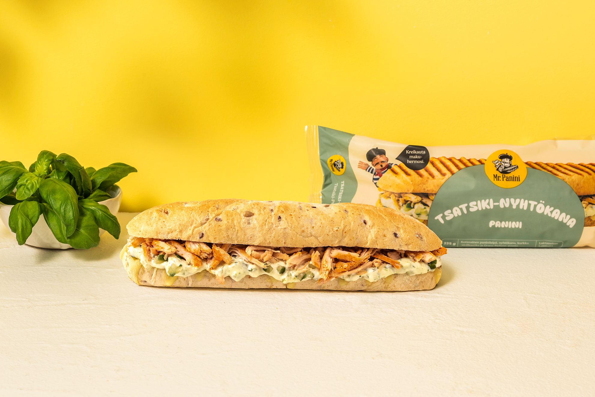 NYHET! Mr. Paninis Tsatsiki-pulled kycklingpanini bjuder på smaker från det grekiska köket. Mellan två skivor av ett krispigt paninibröd med linfrön och solrosfrön finns en rejäl portion av mört tillagad finsk pulled kyckling, paninikökets egen fräscha gurk-aiolisås och italiensk Grana Padano-ost. Smakkombinationen är lagom fräsch, örtig och oemotståndligt saftig. Grilla den krispig i ugn eller på grillplatta och njut! Visste du förresten att paninin också blir underbart god i en airfryer?