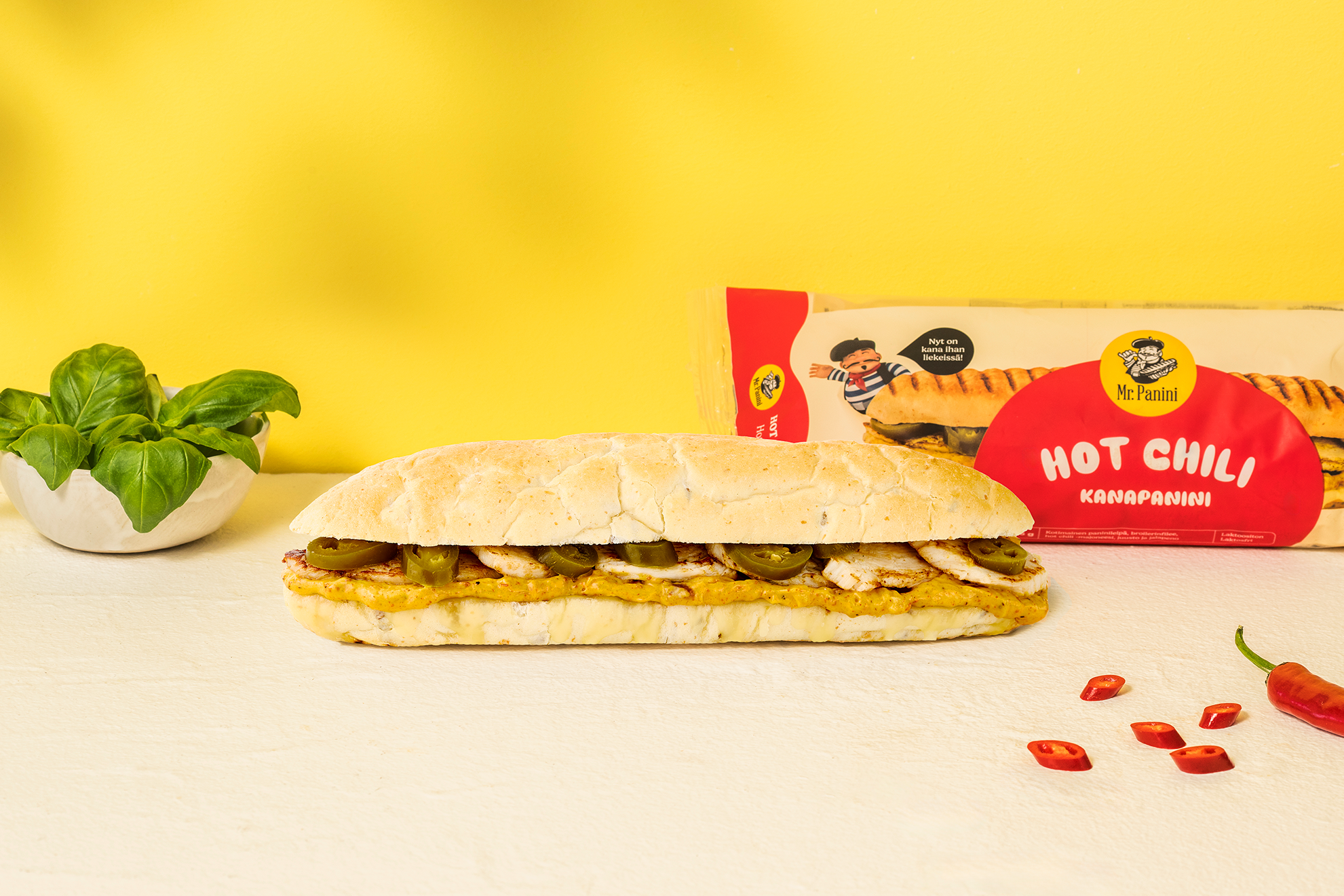 Hot Chili Panini on tulisesti maustettu versio suositusta kanapaninistamme. Rapean, kotimaisesta viljasta leivotun lähileipomon leivän täytteenä on kotimaista kanaa, juustoa ja paninikeittiön omaa chilimajoneesia, joka antaa makunystyröille kyytiä.